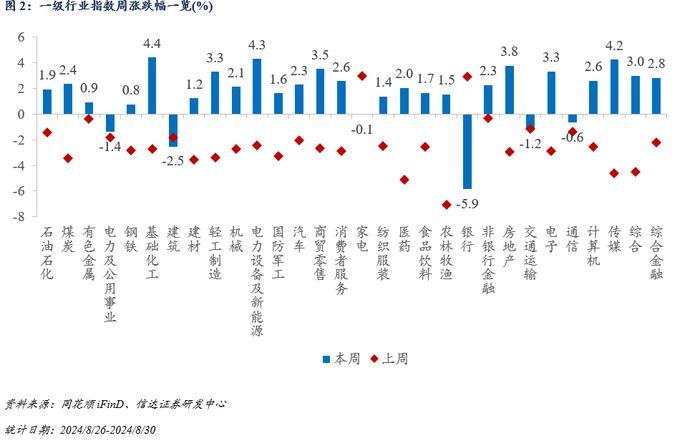 行业指数表现回顾:本周(2024/8/26-2024/8/30)银行行业出现明显回调,其余大部分行业普遍上涨。以银行为代表的红利资产受到前期资金追捧后,下半周迎来大幅回撤,成长板块迎来低位反转。周涨跌幅排名居前的行业有基础化工、电力设备及新能源、传媒、房地产、商贸零售等,收益率依次为4.42%、4.30%、4.23%、3.78%、3.52%;周涨跌幅排名靠后的行业包括银行、建筑、电力及公用事业、交通运输、通信等,收益率依次为-5.86%、-2.52%、-1.40%、-1.16%、-0.64%。