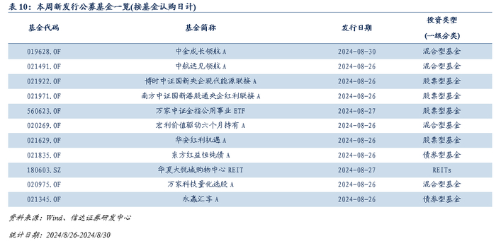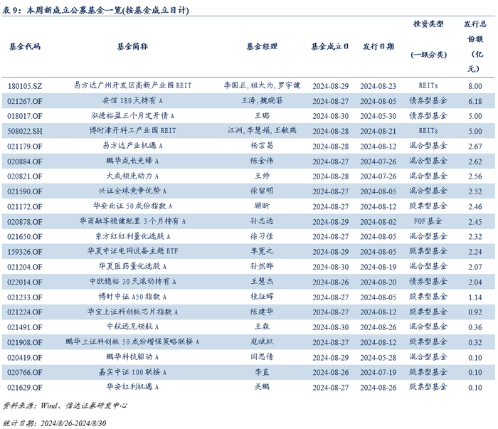 本周境内新成立基金数量共计21只,包括股票型基金7只、债券型基金3只、混合型基金8只、FOF基金1只、REITS基金2只,发行总份额为51.19亿元,发行规模较大的基金包括易方达广州开发区高新产业园REIT、安信180天持有A、泓德裕盈三个月定开债A等,规模依次为8.00亿元、6.18亿元、5.00亿元。
