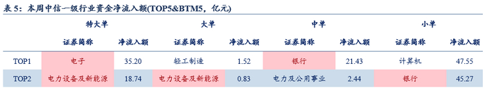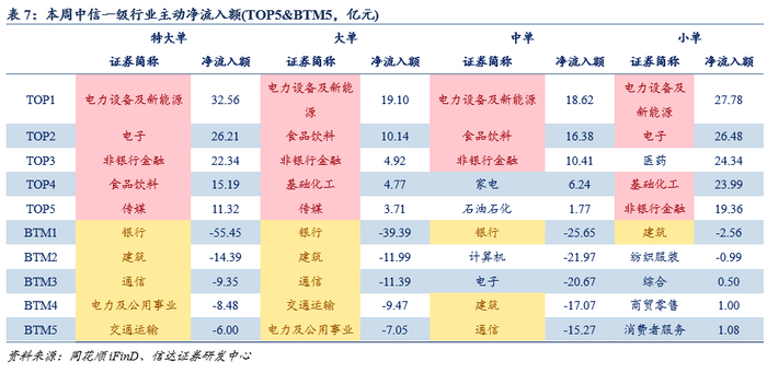 本周下半周市场流动性回补,中小创指数迎来低位反转,市场表现风格分化明显,价值指数相对走弱。资金流方面,市场情绪较为积极,主买净额转正,宽基ETF大幅净流入。板块结构方面,公募基金近期在电子、煤炭、银行等行业上有所增配,特别的是,公募基金近期在银行行业上的配比大幅走高,达到近三年的历史高位,但本周主力/主动资金在银行行业上呈现了明显的净流出趋势,需关注持仓拥挤风险,从短期趋势来看,主力/主动资金更为青睐以电新、电子行业为主的成长板块。在短期市场流动性恢复与市场情绪明显好转的前提下,我们建议持续关注前期相对偏弱的成长板块机会。