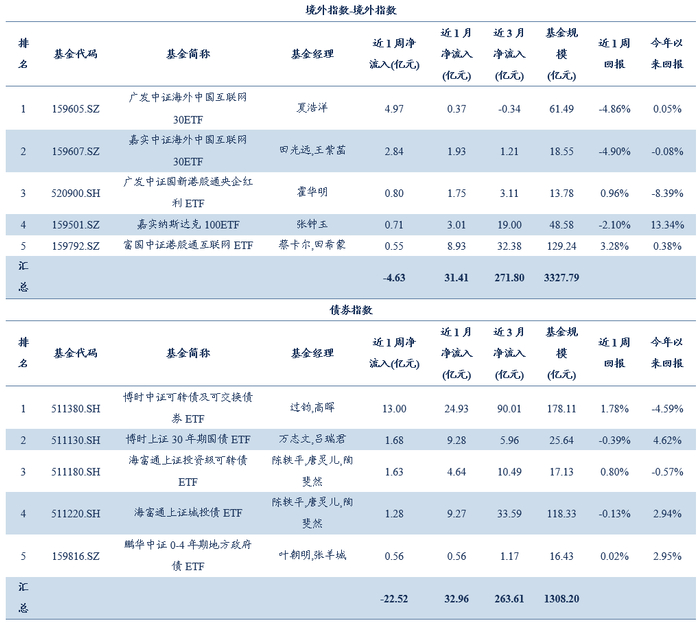 债券ETF方面,本周资金净流出22.52亿元,规模达到1308.2亿元。其中,净流入较多的产品为博时中证可转债及可交换债券ETF、博时上证30年期国债ETF,净流入金额分别为13.00亿元、1.68亿元。