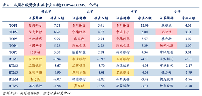 主动资金流:(1)个股:主动资金更看好贵州茅台、阳光电源、比亚迪、宁德时代、中国平安等标的,农业银行、工商银行、深圳华强、中国电建、建设银行等标的遭主动资金净卖出。(2)行业:主买净额居前的行业有:电力设备及新能源、非银行金融、食品饮料、基础化工、电子等;流出较多的行业有:银行、建筑、通信、电力及公用事业、交通运输等。