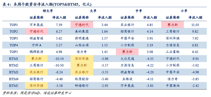 主力资金流:(1)个股:主力净流入&中小单净流出:宁德时代、万丰奥威、领益智造、中国银河、隆基绿能等。主力净流出&中小单净流入:赛力斯、工商银行、农业银行、深圳华强、伊利股份等。(2)行业:主力净流入&中小单净流出:电力设备及新能源、电子、传媒、非银行金融、基础化工等。主力净流出&中小单净流入:银行、通信、电力及公用事业、建筑、汽车等。