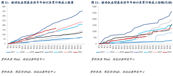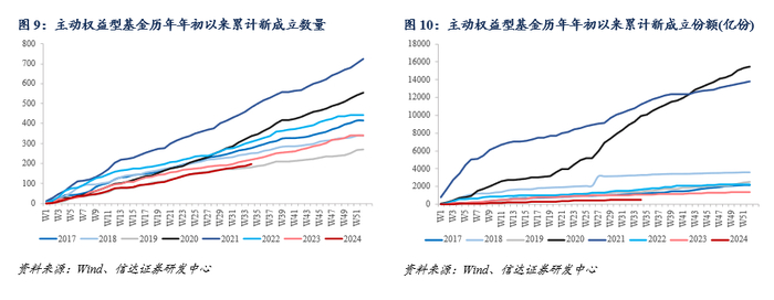 本周境内新成立基金数目共计21只,主动权益型基金新发总份额约为15.33亿元,为近1年56%分位。今年以来主动权益型基金新发197只,规模合计约535.90亿元;被动权益型基金新发168只,仅次于2021年同期,规模合计约581.40亿元。