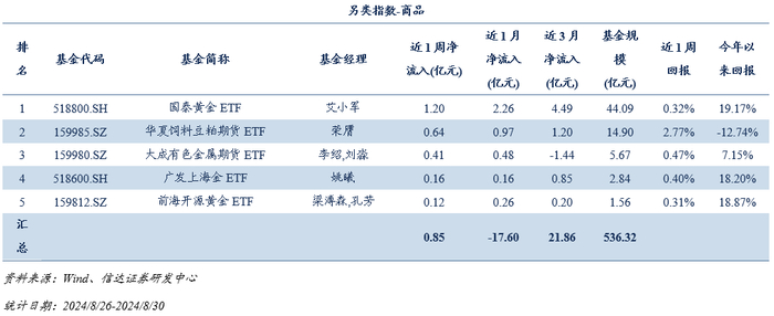 本周(2024/8/26-2024/8/30),各类型ETF基金资金净流入432.41亿元。境内股票ETF方面,本周资金净流入458.71亿元。商品ETF方面,本周资金净流入0.85亿元,规模达到536.32亿元。