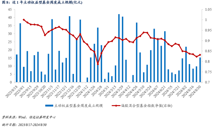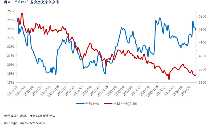 从持股市值加权平均值来看,本周主动权益型基金整体仓位较上周有所下降,“固收+”基金仓位略有上升。截至2024/8/30,主动权益型基金的平均仓位约为83.75%。其中,普通股票型基金的平均仓位约为86.68%(较上周下降0.44pct),偏股混合型基金的平均仓位约为84.34%(较上周下降1.27pct),配置型基金的平均仓位约为81.50%(较上周下降1.39pct);“固收+”基金平均仓位约为24.67%,较上周上升0.44pct。
