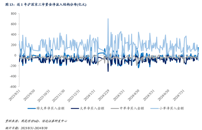 本章的统计基于同花顺对主力资金的划分,标准如下:(1)特大单:成交量在20万股以上,或成交金额在100万元以上的成交单;(2)大单:成交量在6万股到20万股之间,或成交金额在30万到100万之间,或成交量占流通盘0.1%的成交单;(3)中单:成交量在1万股与6万股之间,或成交金额在5万到30万之间的成交单;(4)小单:成交量在1万股以下,或成交金额在5万元以下的成交单。