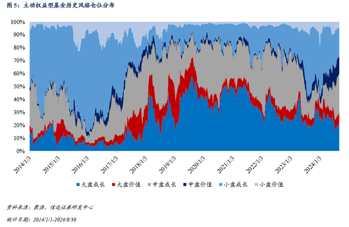 本周中盘价值仓位下降。近三月,中盘成长风格均增配明显,配置比例提升12.31pct。截至2024/8/30,主动偏股型基金大盘成长仓位21.19%(较上周上升0.8pct),大盘价值仓位9.3%(较上周上升0.39pct),中盘成长仓位29.65%(较上周上升0.12pct),中盘价值仓位13.02%(较上周下降1.12pct),小盘成长仓位22.79%(较上周上升0.39pct),小盘价值仓位4.05%(较上周下降0.57pct)。
