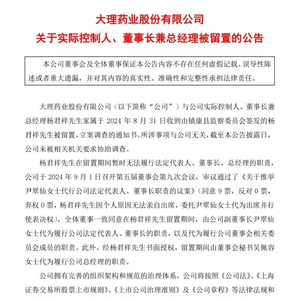 9月1日下午,*ST大药(公司名:大理药业)发布公告,公司与公司实际控制人、董事长兼总经理杨君祥的家属,于8月31日收到由镇康县监察委员会签发的杨君祥被留置、立案调查的通知书。