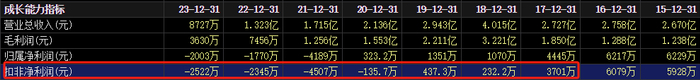 在此背景下,2017年上市当年大理药业扣非净利润就大幅下滑近40%,2018年再下滑90%以上,2020年开始亏损,持续亏损四年,2023年扣非净利润亏损2522万元。