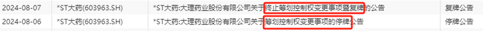 此前在8月6日,大理药业曾发布公告,收到公司控股股东及实控人杨君祥通知,其正在筹划协议转让公司股份事宜,该事宜可能导致公司控制权发生变更,公司同时宣布停牌。但是,仅过了一天,8月7日公司便公告,终止筹划控制权变更事项并复牌,堪称“闪电变卦”。