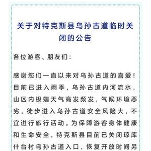 1日中午1点03分,特克斯县文旅局发布了《关于对特克斯县乌孙古道临时关闭的公告》,称“目前已进入雨季,乌孙古道内河流水,山区内极端天气高发频发,气候环境恶劣,徒步进入乌孙古道安全风险大,不宜进行旅行活动。为保障游客身体健康和生命安全,特克斯县目前已关闭琼库什台村乌孙古道入口,恢复开放时间另行通知。由此给您带来不便,敬请谅解。”