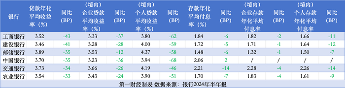 从资产负债端最关键的贷款收益和存款成本来看,各家大行今年上半年的贷款年化平均收益率(主要为境内口径)同比普遍下降了30BP以上,其中工商银行、建设银行降幅超过40BP。相比2023年全年的同比变化,今年上半年仅农业银行降幅好转、邮储银行降幅持平,其他4家大行贷款收益同比降幅均有不同程度扩大。