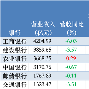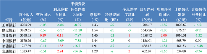 具体到各家银行,仅农业银行“一枝独秀”保持了营收和归母净利润的同比小幅正增长,其余5家大行均“双降”。其中,工商银行营收和归母净利润降幅分别为6.03%、1.89%,降幅在大行中均居首位;其次是建设银行,该行营收、归母净利润分别下降3.57%、1.8%;交通银行营收降幅也在3%以上,归母净利润则下滑1.63%。