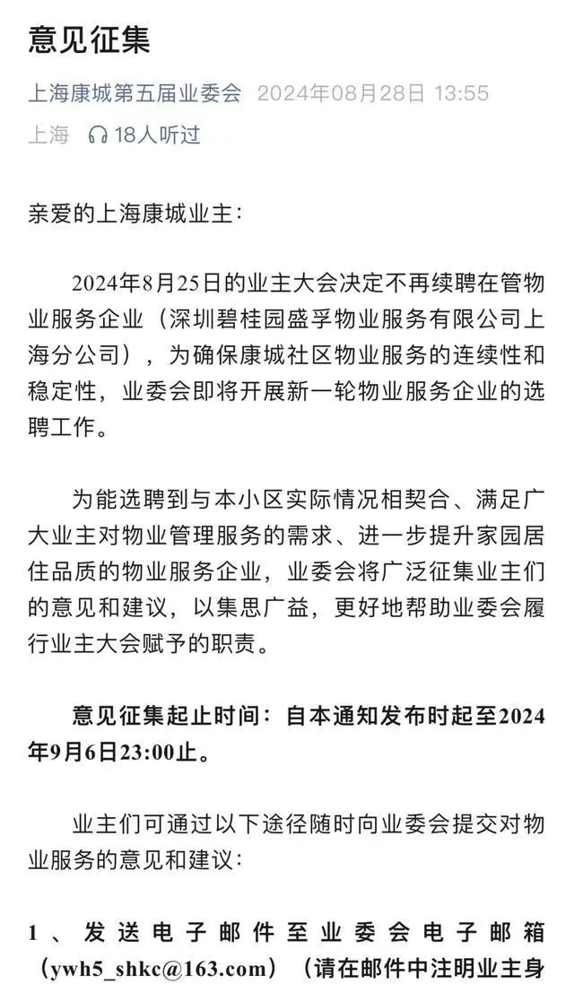 8月26日,上海康城第五届业主委员会在微信公众号上发布了一则公告称,经小区业主投票表决,决定不再续聘在管物业服务企业。