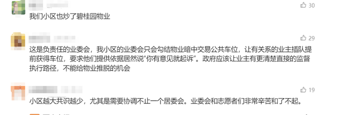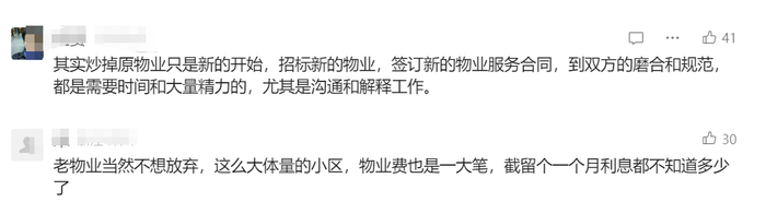 有网友点评指出,“我们小区也想换,康城的物业问题,我们同样有”“炒掉了,物业费不涨,有新公司接盘吗?服务质量会提升吗?……后续关注”“现在都是不提高物业费,物业就摆烂!更大的问题是很多小区没有业委会,有的对物业监督不到位”“不管换哪个公司,关键要有有效的监管制度,才可能切实做好服务工作”!