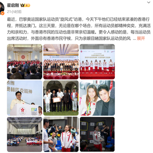 “最近,巴黎奥运国家队运动员‘旋风式’访港,今天下午他们已经结束紧凑的香港行程,并抵达澳门。这三天里,无论是在哪个场合,所有运动员都精神奕奕,充满活力和亲和力,与香港市民的互动也是非常亲切温暖。更令人感动的是,每当运动员出席活动时,外面总有香港市民守候,只为亲眼目睹国家队运动员的风采。”