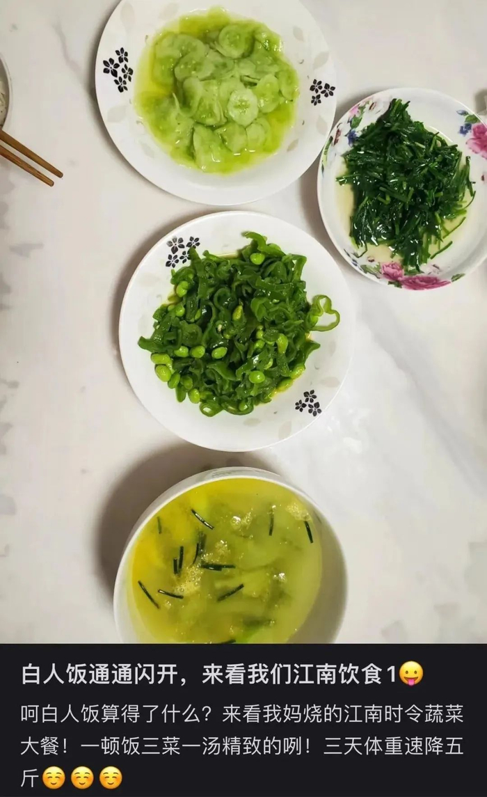 于是,第一批跳出轻食骗局的年轻人,开始通过服用“色香味弃权”的食物,从源头上遏制住自己的食欲,比如跟英国老头学吃干巴lunch,或是直接生啃没加过工的食材。最近,打工人们则爱上了号称“饭缩力”最强的江浙沪饮食。