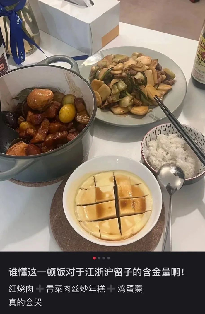 有人调侃,“江浙沪人是最难杀的一群人,像留子一样吃啥都能活。”今年刚到英国留学的宁波人比格猫,“每个留子都会被迫成为厨子,因为大家都觉得白人饭很难吃,但我就好接受多了,因为大家一口也吃不下去的‘仰望星空’,我小时候就在宁波吃过原版了。”
