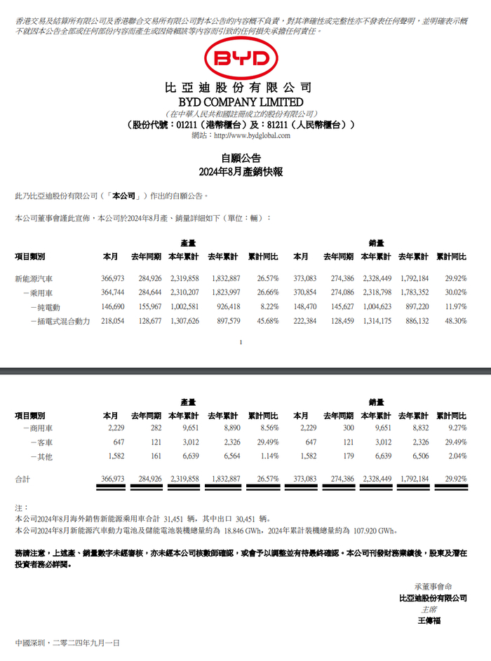 比亚迪9月1日公告,公司8月新能源汽车销量373083辆,同比增长36%,纯电动乘用车销量148470辆。比亚迪董事长王传福在日前举办的2024腾势汽车科技日上表示,比亚迪持续加码智能驾驶,已自研车载计算平台,成立感知实验室、研发端到端大模型,并自建超算中心。