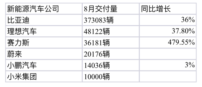 9月1日,中国主要新能源汽车上市公司发布2024年8月销量数据。其中,以蔚小理为代表的造车新势力数据表现较好,比亚迪月销突破37万辆。而跨界汽车领域的华为和小米集团也迎来“收获季”,和华为合作的赛力斯8月销量同比增长达479.55%,小米SU7月交付量超过1万辆。