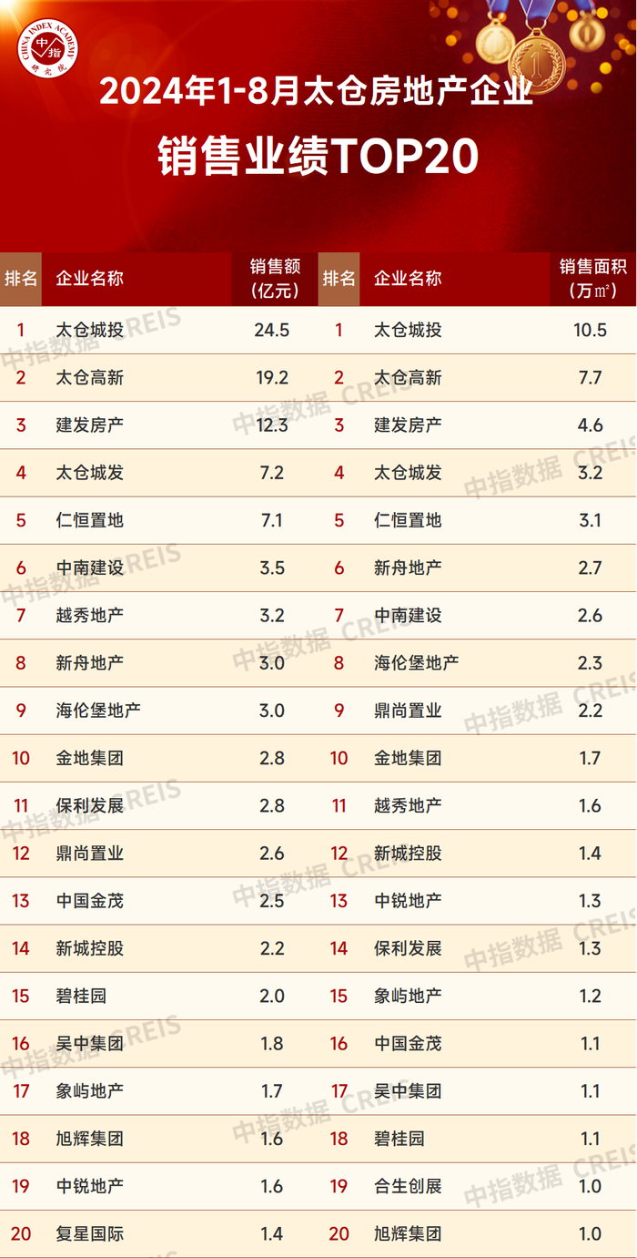 特别声明:房地产企业销售数据统计是以2024年1月1日-8月25日期间销售的商品房为统计口径,主要依据中指数据CREIS(点击查看)在太仓市的销售监测数据,并参考当期总体经营情况和推盘去化情况进行分析统计;对于少数没有在监测范围内的项目,由企业提供相关证明文件,经课题组对数据进行严格审核,也纳入统计范围。本报告仅供参考,课题组不对使用报告及其内容所引发的任何直接或间接损失承担责任。