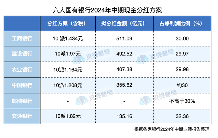 目前,已有工、农、中、建、交5家国有银行披露了详细的中期现金分红方案。其中,工行拟分红金额最多,达到511.09亿元;建设银行每10股派发金额最多,为1.97元。而交通银行分红比例最高,占归属本行股东净利润比例为32.36%。