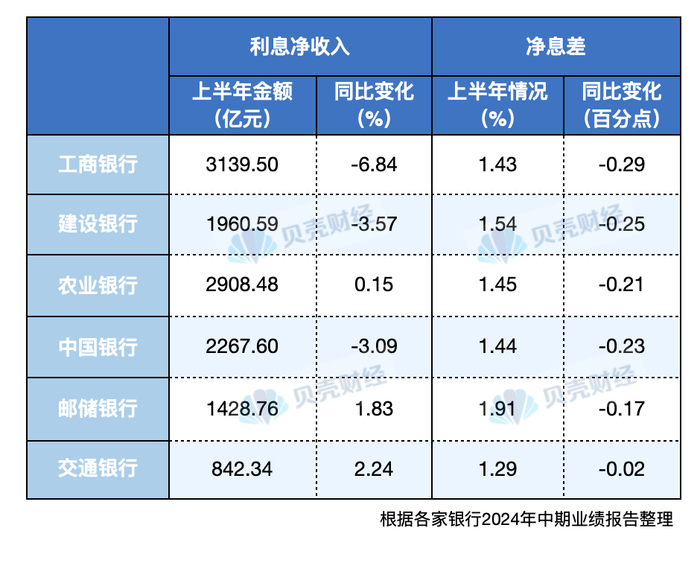 据贝壳财经记者梳理,6家国有银行中,工行虽仍是6家国有银行中赚钱最多的银行,但其同比降幅亦最大。数据显示,该行上半年营业收入为4204.99亿元,同比下降6.03%;归属本行股东净利润为1704.67亿元,同比下降1.89%。