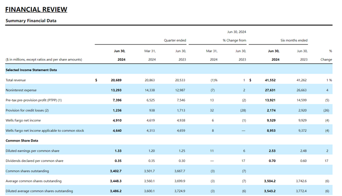从最新财报来看,2024年第二季度,富国银行总营收为206.89亿元,上年同期为205.3亿美元;净利润49.1亿美元,同比下降0.57%;公司的净利息收入为119.2亿美元,同比下降9%,主因存款成本上升和贷款余额下降,低于分析师平均预期的121亿美元。