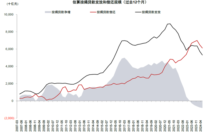 存量利率下调预期再起。我们在2024年2月的报告《利率太高还是太低:降息后的思考》中提示存量按揭利率仍然偏高带来的早偿压力,去年四季度存量按揭利率下调后,2024年5月取消全国层面新发放房贷利率下限,此后新发放房贷利率加点再度下行。根据央行数据,截至6月新发放房贷利率3.45%,如果考虑7月的LPR下调估计新发放利率在3.35%左右,相比2023年12月的3.97%下行62bp,而存量按揭利率下调幅度仅为35bp,我们测算存量房贷利率和新增利率的利差再度回到约60-70bp的高位,并且大部分重定价在2025年年初。因此,按揭早偿率仍位于14%左右的高位,并且可能存在使用消费和经营贷置换按揭的空间。