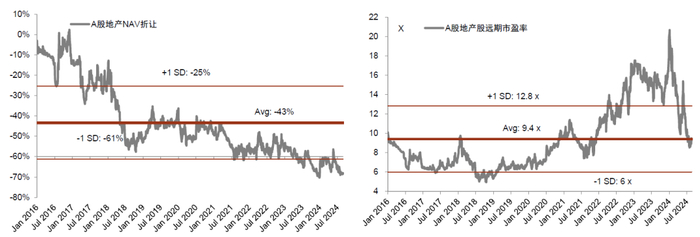 图表7:A股房企NAV折价及PE band
