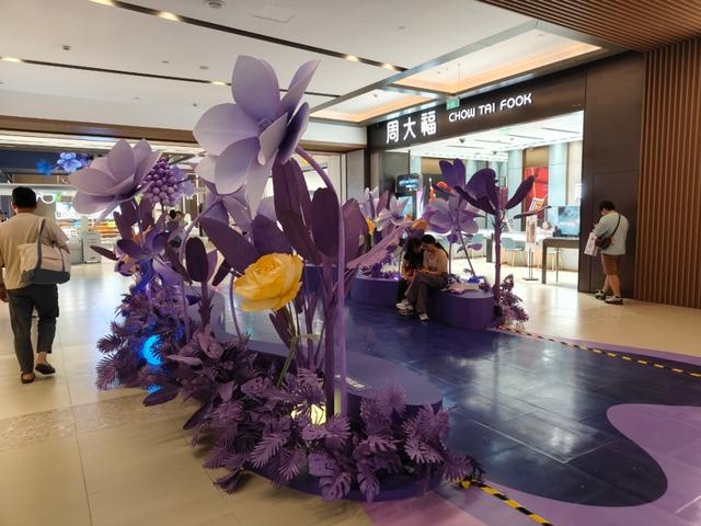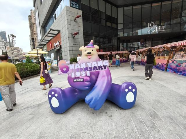 六年前,南洋1931花落徐家汇,坐落于裕德路165号,是一个占地总建筑面积超过5万平方米的大型综合性商业体,汇集了众多品牌商铺和餐饮店铺,可以满足顾客“吃饭、娱乐、购物、学习、亲子”的多种需求。来到南洋1931,最引人瞩目的是周年庆的美陈——在商场的整个外圈制作了以紫色为主色调的“花路”,紫色的花朵元素贯穿了南洋1931的所有设施。紫色的招风旗、门口坐着一只憨态可掬的紫色大熊、玻璃幕墙、地板、楼梯……紫色元素无处不在。一楼大堂中间的顾客休息区,装饰了硕大的紫色花朵,宛如童话世界,吸引了不少顾客驻足拍照。“拼搏无边界”“勇者无惧”“以梦为马不负韶华”……一句句缠绕着美丽花束的话语,是南洋1931希望通过庆典向外界传达的理念和力量。