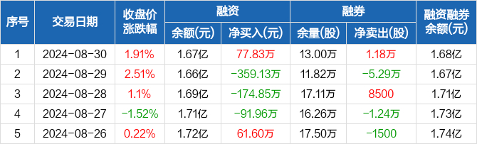 融资方面,当日融资买入683.36万元,融资偿还605.54万元,融资净买入77.83万元。融券方面,融券卖出1.2万股,融券偿还200股,融券余量13万股,融券余额124.66万元。融资融券余额合计1.68亿元。