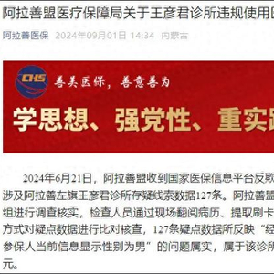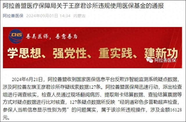 内蒙古自治区阿拉善盟医疗保障局微信公众号“阿拉善医保”9月1日发布阿拉善盟医疗保障局关于王彦君诊所违规使用医保基金的通报。