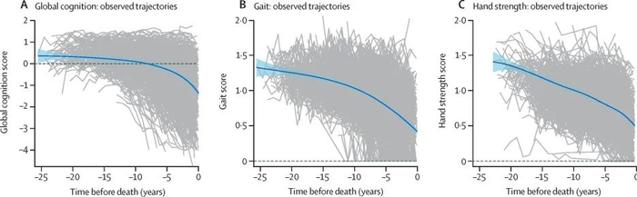 平均而言,步态功能和手部力量衰退早于认知能力衰退。参与者的认知能力在死亡前25-15年间大致保持稳定,此后开始衰退,并在死亡前5年加速衰退。相比之下,步态功能和手部力量在整个研究期间呈持续衰退趋势。