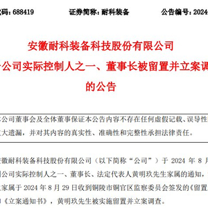 8月30日盘后,耐科装备发布公告称,公司于2024年8月30日收到公司实际控制人之一、董事长、法定代表人黄明玖家属的通知,黄明玖家属于2024年8月29日收到铜陵市铜官区监察委员会签发的《留置通知书》和《立案通知书》,黄明玖被实施留置并立案调查。