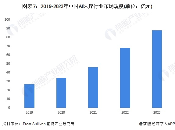 2019-2023年,在产业政策的支持下,智能硬件和人工智能技术快速发展,从而推动中国AI产业化进程的加速。AI医疗行业作为AI产业的重要分支,得到了高速的发展,中国AI医疗市场规模从2019年的27亿元快速增长至2023年的88亿元,年复合增速达34%。