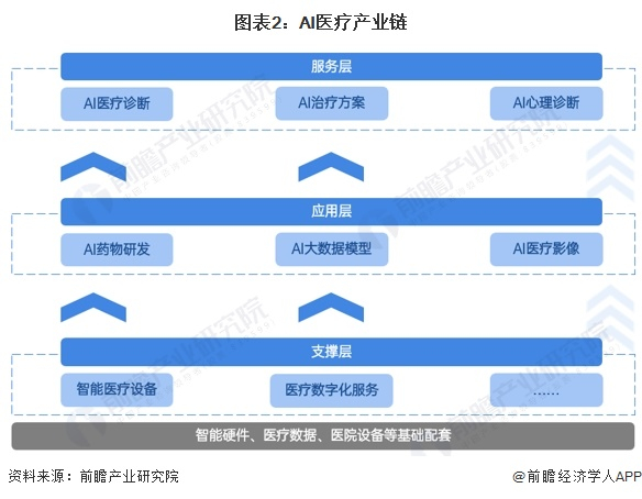 AI医疗行业产业链可分为支撑层、应用层和服务层,支撑层主要包括智能医疗设备以及医疗数字化服务;应用层主要包括AI药物研发、AI医疗大数据模型等,是目前中国AI医疗产业发展的重点;服务层则是在患者诊疗层面,运用AI模型进行辅助诊断、辅助决策、辅助手术等活动。