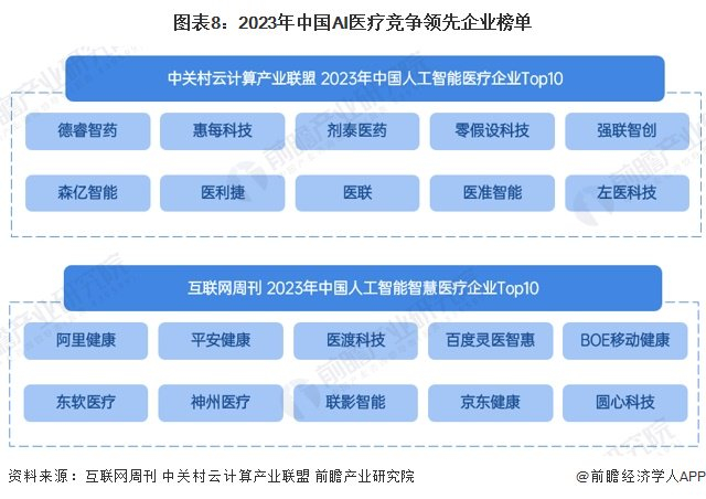 根据互联网周刊以及中关村云计算产业联盟相关榜单,一方面,中国AI医疗行业快速发展,诞生了一批以德睿智药、剂泰医药、零假设科技、森亿智能为代表的新兴企业,且已经具备了一定的技术积累和品牌效应;另一方面,以阿里、平安、百度、京东为代表的大数据模型企业AI医疗布局力度持续加大。