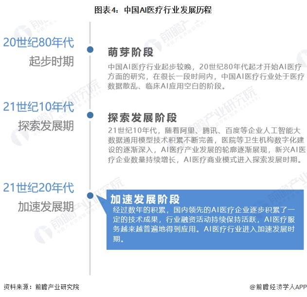 中国AI医疗行业起步较晚,20世纪80年代起才开始AI医疗方面的研究。21世纪10年代,随着阿里、腾讯、百度等企业人工智能大数据通用模型技术积累不断完善,医院等卫生机构数字化建设的逐渐深入,AI医疗产业发展的轮廓逐渐展现。近年来,国内领先的AI医疗企业逐步积累了一定的技术成果,行业融资活动持续保持活跃,AI医疗服务越来越普遍地得到应用,AI医疗行业进入加速发展时期。。