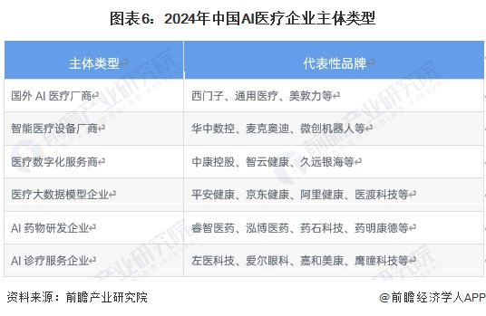 从中国AI医疗企业主体类型来看,AI医疗供应主体主要包括以西门子、通用医疗、美敦力为代表的国外厂商;华中数控、麦克奥迪、微创机器人为代表的智能医疗设备厂商;以平安健康、京东健康、阿里健康、医渡科技为代表的医疗大数据模型企业;以睿智医药、泓博医药、药石科技、药明康德为代表的AI药物研发企业;以左医科技、爱尔眼科、嘉和美康、鹰瞳科技为代表的AI诊疗服务企业。