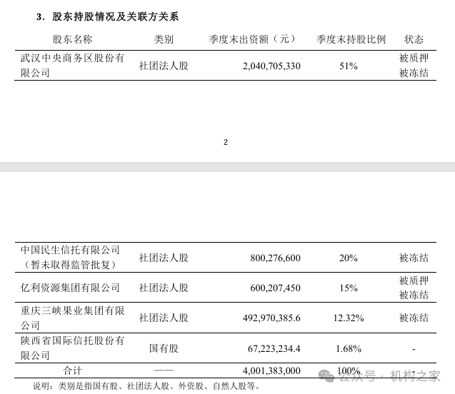 尤其值得关注的是,亚太财险的股权结构亦迷雾重重。根据亚太财险2024年二季度偿付能力报告,公司高达98.32%的股份被质押冻结,其中第一大股东武汉中央商务区股份有限公司直接控股民生信托,背后则是泛海系。叱咤一时的泛海控股,这个曾经雄心勃勃想要打造全牌照金控集团的企业,现在却因为深陷债务泥潭而举步维艰。其与民生信托、长城资产、民生银行、融创集团等众多金融机构的债务纠葛,被监管列入诚信档案,朝不保夕,更是令亚太财险的未来蒙上了阴影。
