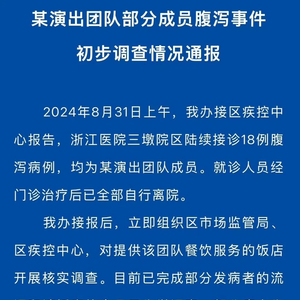9月1日,浙江省杭州市西湖区食品药品安全委员会办公室发布《某演出团队部分成员腹泻事件初步调查情况通报》,详情如下: