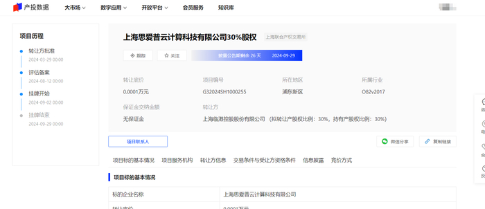 上海临港控股挂牌转让思爱普云计算30%股权,底价1元