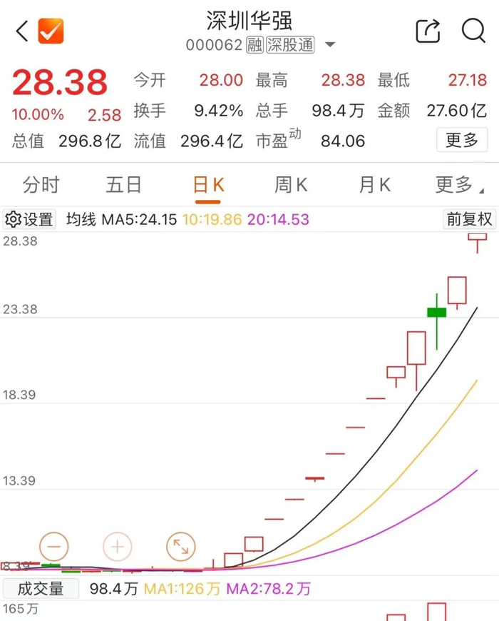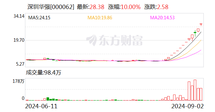 截至午间收盘,深圳华强报28.38元/股,成交额27.60亿元,最新总市值接近300亿元。自8月15日以来,深圳华强股价节节走高,区间累计涨幅达225.83%。