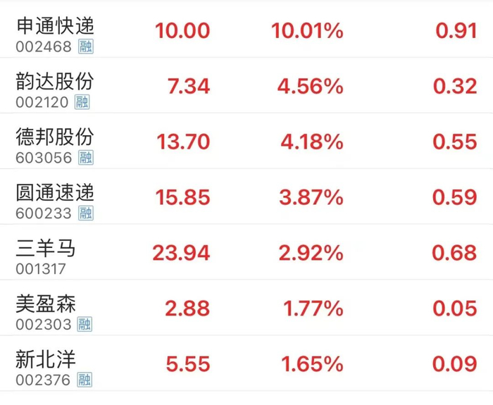 快递物流概念股早盘走势活跃。截至午间收盘,申通快递涨停,韵达股份、德邦股份、圆通速递、三羊马等跟涨。