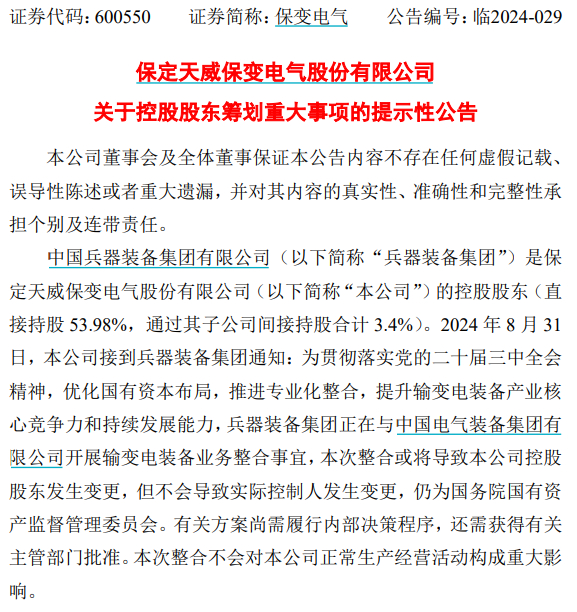 9月1日晚间,保变电气公告,公司接到控股股东中国兵器装备集团有限公司(下称“兵器装备集团”)通知,兵器装备集团正在与中国电气装备集团有限公司(下称“中国电气装备”)开展输变电装备业务整合事宜,本次整合或将导致本公司控股股东发生变更,但不会导致实际控制人变更,仍为国务院国资委。