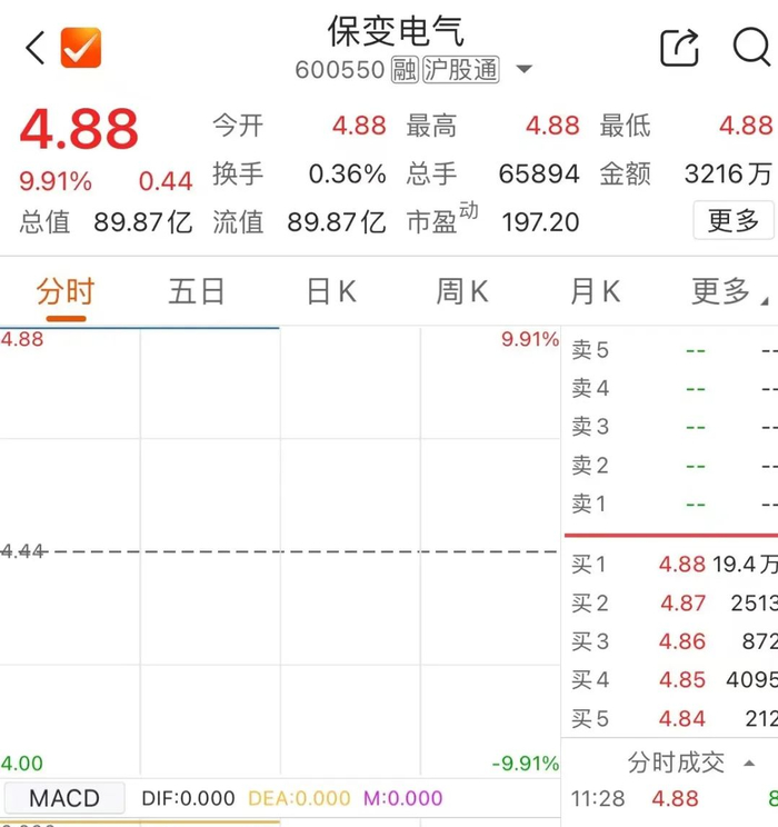 个股方面,今日早盘,深圳华强再度涨停,走出13天12板行情。保变电气开盘后一字涨停,报4.88元/股。