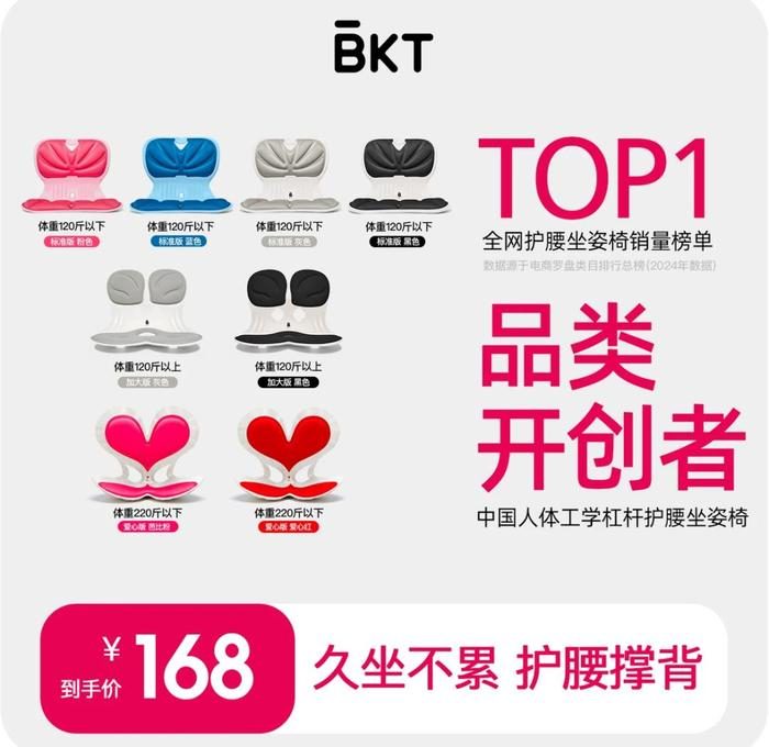 将久坐不累、护腰作为卖点,BKT拿捏住了办公人群、学生等群体的需求,