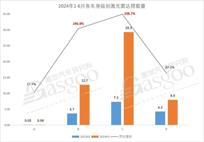 在车型级别上,D级车市场虽高端但总体销量有限,而B级车和C级车则凭借更广泛的智驾消费群体和市场需求,成为激光雷达上车的主要车型级别。2024年上半年,B级车激光雷达搭载量为12.7万颗,同比增长246.8%,C级车搭载量达29.3万颗,同比增长298.7%。值得注意的是,未来B级车市场的同比增长速度有望超过C级车,成为主要的增量区间。