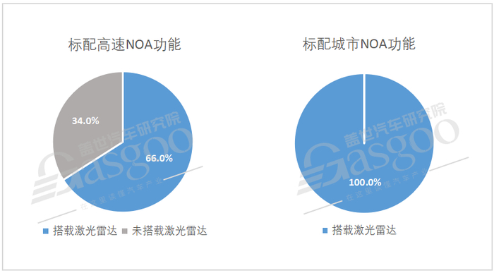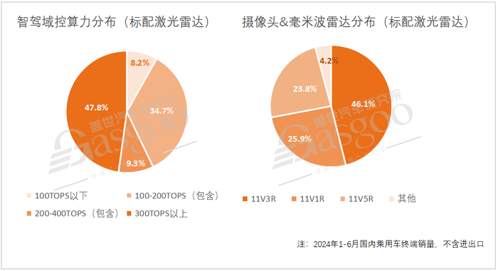当前,标配高速NOA功能的车型中,其中三分之二均配备了激光雷达,而标配城市NOA功能的车型更是100%搭载了激光雷达。在传感器的搭配选择上,搭载激光雷达的车型均采用多传感器融合方案,普遍搭载11个以上的摄像头和多个毫米波雷达。除此之外,在智驾域控算力的分布上,目前较为分散,但绝大多数方案均采用了100TOPS以上的域控算力。